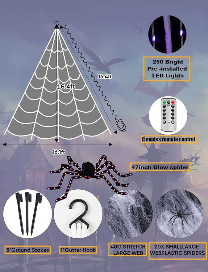 - 【8 Lighting Modes】: Illuminate your space with the Halloween Spider Web Lights' 125 purple LED lights and 8 different lighting modes. From flashing to light-changing patterns, the spider web lights offer a variety of options to suit your preference. Switch between modes effortlessly using the included remote control. Get creative and add more excitement to your decorations.spider web spider web decoration halloween spider web spider web tights