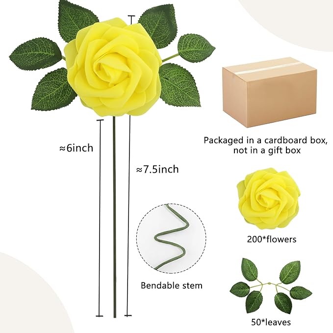200PCS Yellow Artificial Flowers Roses Real Looking Foam Fake Roses with Leaves for DIY Wedding Bouquets Bridal Shower Party Decorations (Yellow, 200)