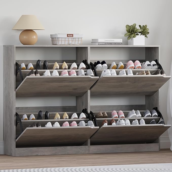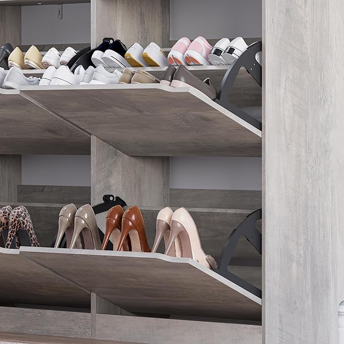 - Customizable Storage with Adjustable & Removable Panels: Each of the four flip-out drawers includes a 2-tier shoe organizer with adjustable dividers. The removable panels allow you to store various types of shoes—sneakers, high heels, flats, ankle boots, or even slippers. With deep compartments and tilt-out doors, this tall shoe storage cabinet keeps your favorite pairs visible and accessible.